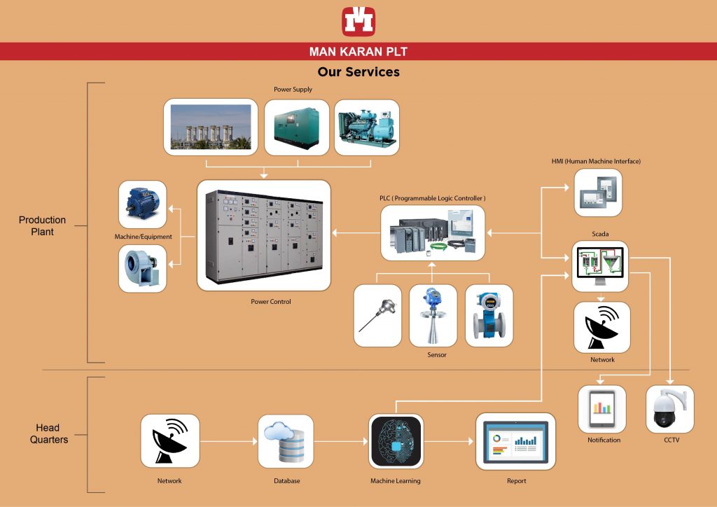 OUR SERVICES SMART Factory (IR 4.0) Design (based on process flow)Automate the processRemote the processNotification (Email, Mobile)Reporting for maintenance, production and etcTesting and commissioningRemote and on-site troubleshooting Power SupplyGenset, Biogas EngineCabling (surface, trenches, underground and etc)Test run with and without load Tenaga Nasional Berhad (TNB)Application for service SwitchboardLow voltage switchboard including install, testing and troubleshootMain breaker such as ACB, VCB, MCCB and etcProtection device such as ELR, IDMT and etcMeasurement device such as digital power meter, amp meter and etc Motor Control Center (MCC) / Motor StarterDesign, install, testing and troubleshoot for :Direct online starter (DOL)Star Delta starterAuto Trans starter @ Auto-transformer starterSoft starterInverter starteretc Programmable Logic Controller (PLC)Design functional (based on process flow)Installation and configuration PLC hardwareInternal wiring system including power supply, I/O terminal block and relayPLC programming workTesting and commissioning PLC systemRemote and on-site troubleshooting Human Machine Interface (HMI)Design functional (based on process flow)Installation and configuration hardwareConfiguration between PLC and HMIHMI programming workTesting and commissioning HMI systemRemote and on-site troubleshootingData logger Supervisory Control and Data Acquisition (SCADA)Design functional (based on process flow)Installation and configuration SCADA hardwareSCADA programming workTesting and commissioning SCADA systemRemote and on-site troubleshooting Machine / EquipmentCabling and testing machine, equipment and other related to power supply Common Electrical LoadSupply, install, wiring and testing lighting such as fluorescent, high bay, spotlight and compound lightingSupply, install, wiring power point (Single and three phase) SensorSupply, install, scalling, and testing analog and digital sensor such as pressure transmitter, flow meter and etc